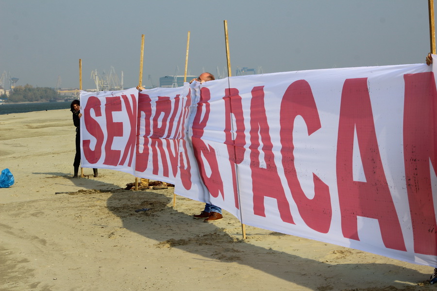 Fiindcă trăim vremuri de cumplite excitații demagogice și populiste – cu viceprimarul Picu al Galaților exhibându-se în direct și la o oră de vârf pe canale naționale, grupul de activiști de la Comunitatea Curățăm Galațiul a realizat astăzi o mică demonstrație de tema fixată de Adetin Picu de la Primăria Pucheanu. A expus pentru circa jumătate de oră (probleme cu vântul puternic!) un banner uriaș, lung de 30 de metri, pe care au scris cu litere de 1,5 metri mesajul de tip „Piei drace!” emanat de insuportabilul Picu Polonic: „Sex, drugs & păcănele!”. Să nu vă mirați dacă pe nisipurile umblătoare ale insulei Cocuța-Chiciu o să vedeți într-o zi cum se debarcă cu mare învălmășeală toți pensionarii-turiști din Croazierele pe Dunăre. Asta vor, astă le dă Picu Polonicu Păcănele!