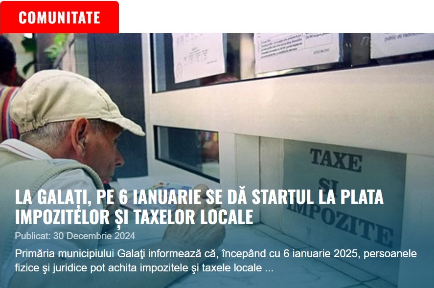 Așa că, după cum credem că ați aflat deja din ziarele obediente din Galați, cum este cazul Monitorul de Galați (vezi foto mai jos), care s-au grăbit să vă anunțe că ar trebui să vă plătiți taxele și impozitele locale încă de pe data de 6 ianuarie 2025, ne facem și noi datoria să vă spunem că ar fi cazul să vă puneți încă din această seară la coadă.
