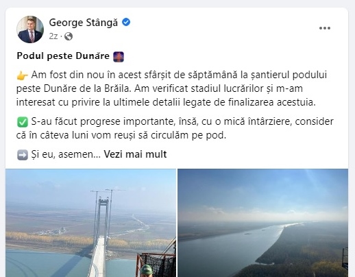 “Am fost din nou în acest sfârșit de săptămână la șantierul podului peste Dunăre de la Brăila. Am verificat stadiul lucrărilor și m-am interesat cu privire la ultimele detalii legate de finalizarea acestuia.