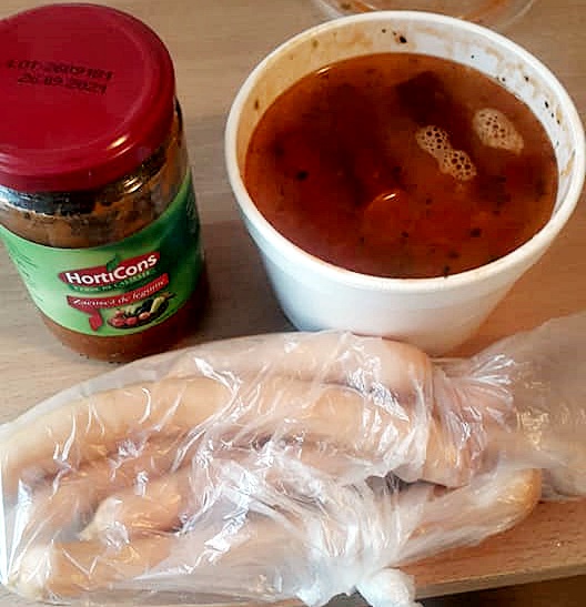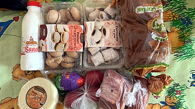Și ne trimite două poze cu ultimele livrări făcute de Primăria Galați la standardul de 70 de lei mâncarea de persoană pe zi. Din poze observăm că, în sfârșit, s-a adus și ceva dulce oamenilor. Ieftin și de slabă calitate, alături de câteva roșii vopsite de Paști, dar s-a adus. Tot hrană rece, evident. Judecați și dvs.