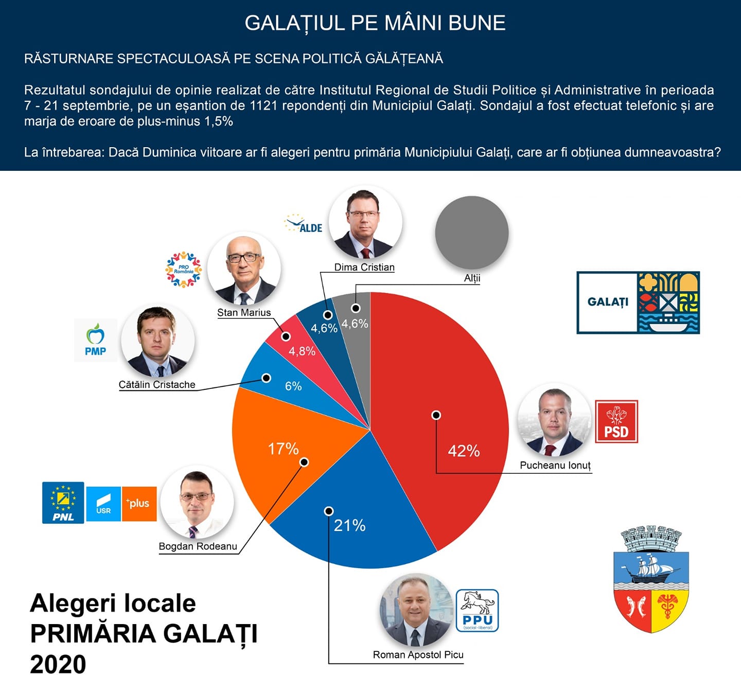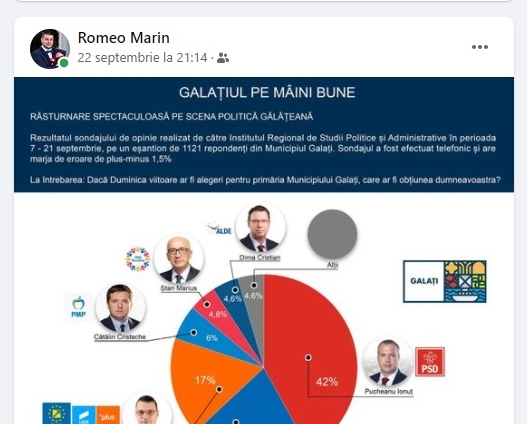 Fostul viceprimar Picu Roman, adică șeful lui pe linie de partid al lui Romeo Marin, era creditat în acel sondaj cu 21% din voturile gălățenilor, fiind al 2-lea după primarul în funcție Ionuț Pucheanu, cotat cu 42% în cursa pentru Primăria Galați.