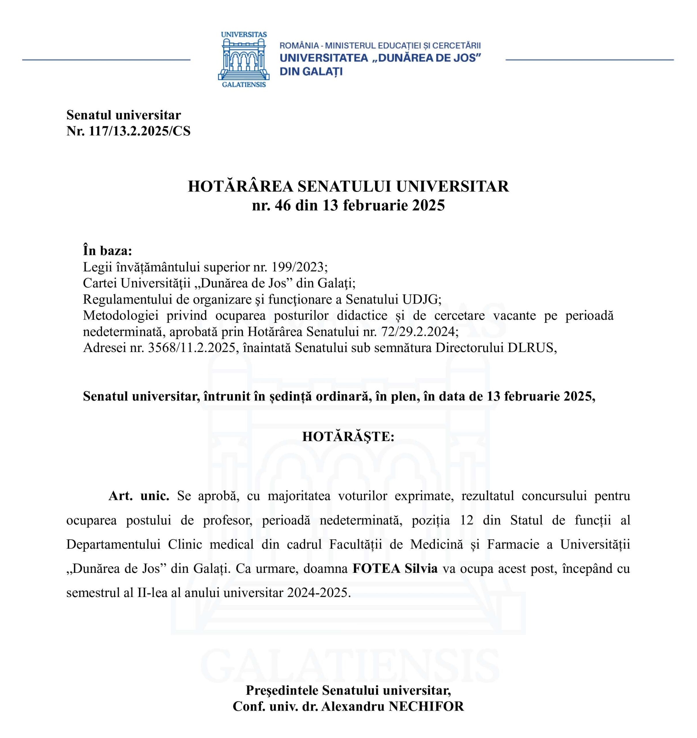 “Se aprobă, cu majoritatea voturilor exprimate, rezultatul concursului pentru ocuparea postului de profesor, perioadă nedeterminată, poziția 12 din Statul de funcții al Departamentului Clinic medical din cadrul Facultății de Medicină și Farmacie a Universității „Dunărea de Jos” din Galați. Ca urmare, doamna FOTEA Silvia va ocupa acest post, începând cu semestrul al II-lea al anului universitar 2024-2025”,