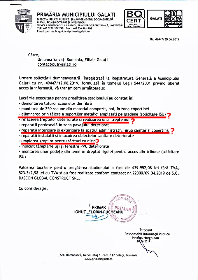 Cei de la USR Galați au făcut și ei o solicitare de informații publice, la scurt timp după articolul publicat aici, pe Alternativa – Jurnalism fără mogul, și au publicat răspunsul lacunar al Primăriei pe contul de Facebook al organizației lor. Pornind de la înșiruirea de acolo și coroborând cu alte date, din răspunsul primit de noi – dar tot lacunare în ce privește sumele cheltuite – am început să ne facem o idee despre magnitudinea risipei de bani publici. Mai ales că, la fața locului, urmele și încercarea de ștergere a lor sunt tot mai evidente.