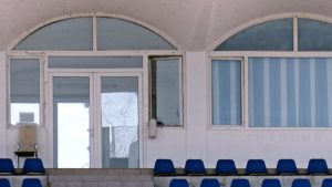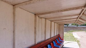 Cât privește scaunele, a trebuit să mergem în cealaltă parte a stadionului să le putem fotografia, din cauza unghiului pieziș în lipsa accesului la tribuna VIP. Dar tot am putut observa că, deși par noi, acestea au fost montate pe… suporții vechi, ruginiți! Iar tâmplăria de PVC nouă nu ni se pare a fi deloc nouă, unde se vede geamul acela deschis părând chiar uzată și jegoasă.