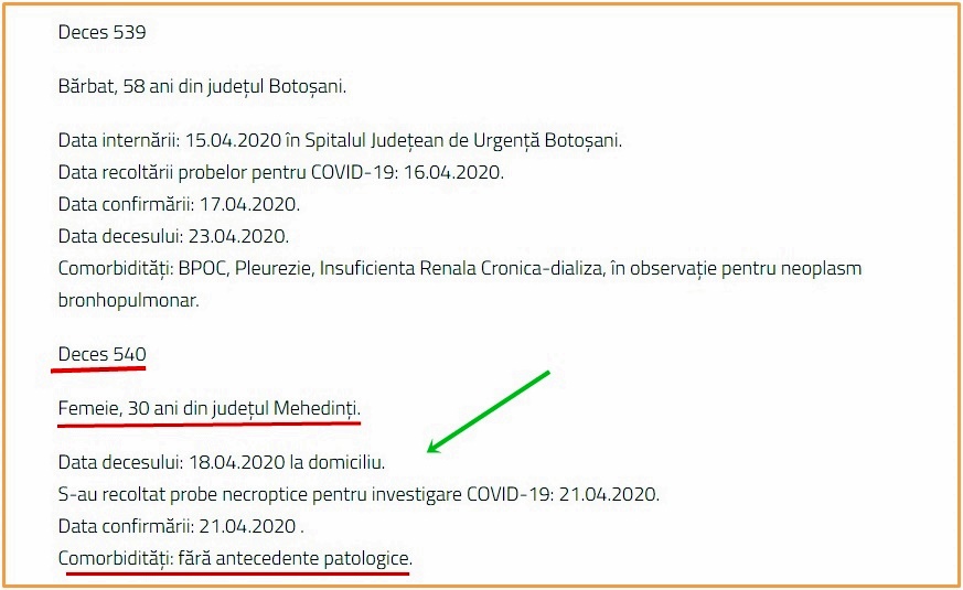 Astfel, la capitolul comorbidități, în raportul oficial prezentat pe www.stiroficiale.ro (vezi facsimil mai jos) se precizează clar: “fără antecedente patologice”.