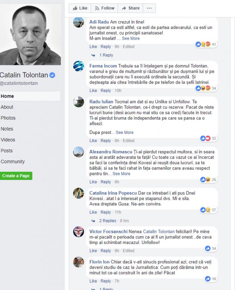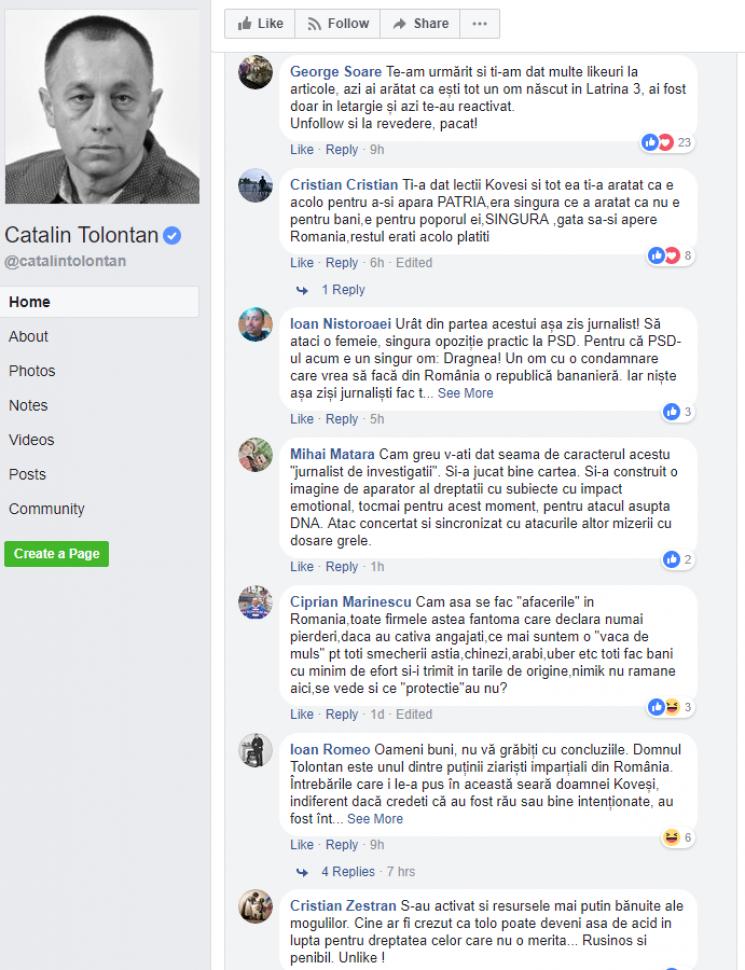 Pe pagina sa de Facebook, Tolontan a strâns peste noapte, la propriu, sute de critici vecine cu insulta. Și asta pentru că, imparțial până la enervare, a insistat să afle totuși ce măsuri a luat sau măcar va lua Kovesi împotriva lui Lucian Onea. Acesta, procuror-șef de la DNA Ploiești, este cel care a tolerat comportamentul procurorului Mircea Negulescu, supranumit „Portocală”, o rușine pentru sistemul judiciar românesc.