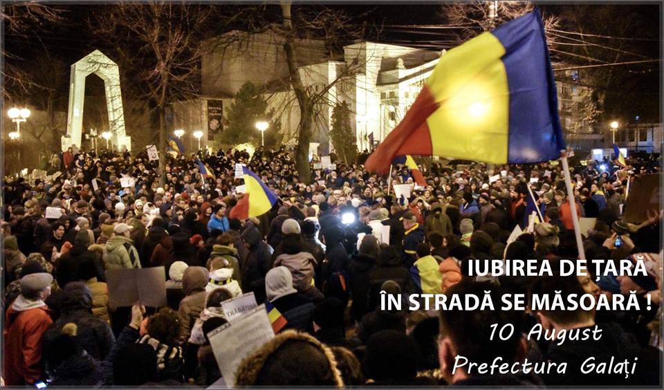 La protestul din fața Prefecturii Galați vor veni și protestatarii #Rezist din Galați, care stau în stradă de mai bine de un an și jumătate, mai exact din 31 ianuarie 2017. Sloganul mitingului este “Iubirea de țară în stradă se măsoară”.