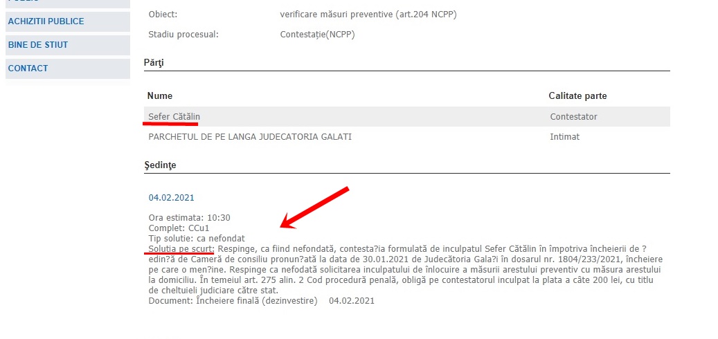 “Soluția pe scurt: respinge, ca fiind nefondată, contestația formulată de inculpatul Sefer Cătălin împotriva încheierii de ședință de Cameră de consiliu pronunțată la data de 30.01.2021 de Judecătoria Galați în dosarul nr. 1804/233/2021, încheiere pe care o menține. Respinge ca nefondată solicitarea inculpatului de înlocuire a măsurii arestului preventiv cu măsura arestului la domiciliu. În temeiul art. 275 alin. 2 Cod procedură penală, obligă pe contestatorul inculpat la plata a câte 200 lei, cu titlu de cheltuieli judiciare către stat”,