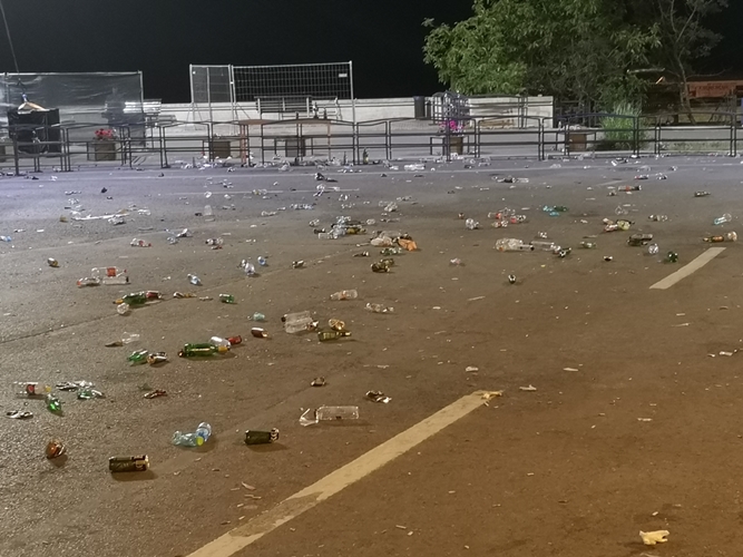 Mă întorceam din zona de food către elice, trecut de ora 23.30, și când am ajuns în zona scenei am observat mizeria ramasă în urmă. Primul gând a fost să-i blamez pe cei din public, cei care au fost la concert, însă după ce am văzut că organizatorul nu a adus mai nimic, măcar câteva pubele mobile, nu e de mirare că gunoiul a ajuns în stradă.
