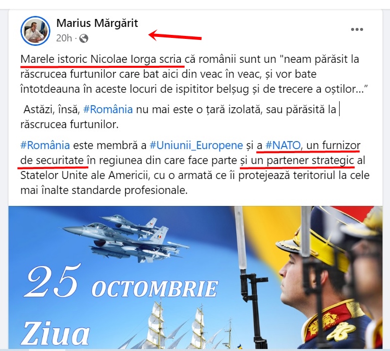Deputatul Marius “Ciasuri” Mărgărit își permite chiar să îl contrazică pe Nicolae Iorga, ba în continuarea postării lui pare că ar vrea să îi spună reputatului istoric român așa, de la obraz, cităm:
