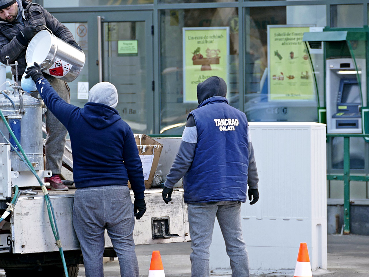 Ei bine, nu s-a născut încă primarul care să umble prin oraș mai mult și mai des ca noi. Așadar iată imaginile cu cei de la Tancrad trimiși ieri (miercuri) dimineață să vopsească în grabă – fără indicatoare de ocolire, fără minim echipament de protecție, măști contra noxelor din vopsea etc., cum cere legea, turnând cu găleata direct în pistolul de vopsit, ca niște amatori – trecerile de pietoni din zona Spicu.
